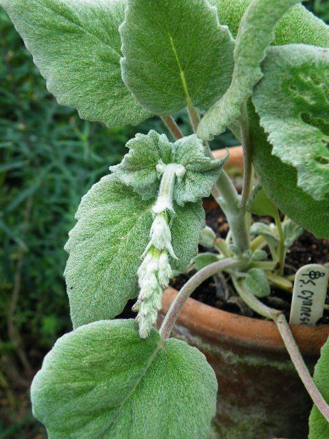 細い花茎はつっと伸びて60cm位になります。よく枝分かれをして花が空中に浮いているように咲きますので、一所にいくつも植えたならそれは美しいでしょう。しかし梅雨が苦手な為、水捌けの良い用土にして、雨に当たらない場所に鉢を置いて育てています。昨年は、蒸れで弱り期待したほど咲きませんでした。猛暑の今年は、なんだか怪しく咲き心引かれるものがあったのですよ。イラン、トルコ原産のサルビアだそうですね。花の時期は短いです。花が終わり種を取った茎を切りましたので、今また高さ15cm位、シルバーの葉だけの静かなサルビアに戻りました。冬の間は無加温のフレームに入れ用心しています。
