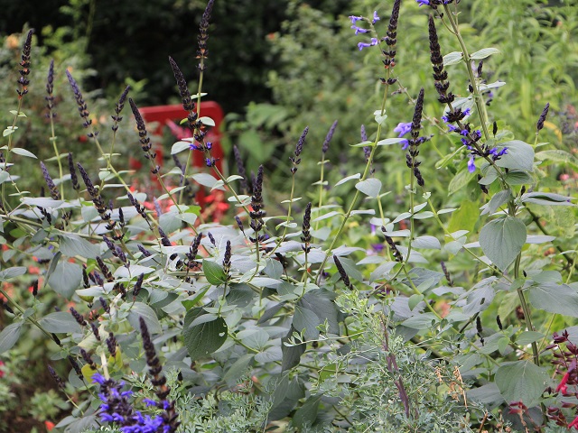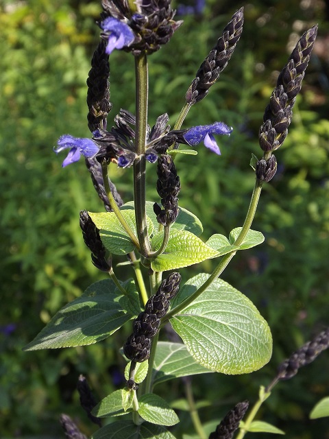 黒に近い濃い紫の萼と苞葉がぎゅっと集まった花穂が、9月頃から空中にたくさん飛んでいる様に目立ち始める一風変わったサルビアです。萼と苞葉はかさかさとしていて、次第に花穂を長く伸ばし咲く花は、毛が生えた深い青紫で花束に使うと綺麗です。秋咲きで霜が降りるまで咲きますね。大らかに育ち2mを超えます。