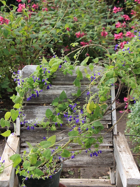 秋にフレーム内で種を蒔き、春に鉢に定植をしました。うちでは茎が1m位に伸び、乱れる様に育ちました。支柱をしてみましたが、枝分かれした茎が次々と折れてしまう為、椅子の背もたれに倚り懸らせてそのままそっとしておくことにしたのですよ。花は比較的小さいですが花穂が長くなると沢山咲き、際立つ深い紫色で下唇にある白の模様が引き立っています。夏に折れた茎を5cm位の長さで挿し木をしておきましたら、秋には30cm位になりこちらも咲き出して綺麗です。成長は早いですね。来年はどんな風に育ててみましょうか?うちは北関東ですので、無加温のフレームで越冬させようと思います。