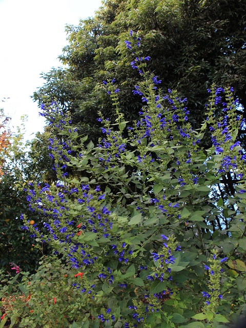毛で覆われたやや紫みを帯びた青色の小さ目な花を沢山咲かせます。10月に入ると少しずつ咲き出し11月の下旬に見頃を迎えます。明るい緑の萼もきれいですね。3年前にこの可愛らしい名前のサルビアの種を蒔きました。大きく育つサルビアで、2mを優に超える高さになったのですよ。横幅も出ますのでひと株で十分見応えがあります。霜で地上部はほとんど枯れますが、落ち葉のマルチで越冬してくれています。挿し木もよく付きますね。旺盛に育ちますので鉢植えは2、3回剪定をして高さを抑えています。