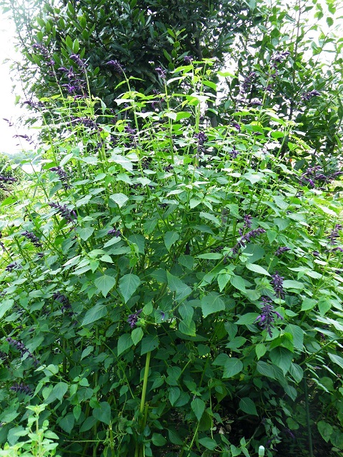 大きな株になり草丈も2m位になるサルビアで、濃い紫の花に一層濃い紫のガクです。ぱっと見は Salvia guaraniticaの色違いのようです。S. guaranitica x S. splendens 、ハイブリットだそうで名前にある ‘Black Knight’ は 黒い騎士 ですね。初夏から霜が降りるまで休みなく次々咲き続け、庭で奥行を感じる暗いスポットを作り出し、ダイナミックで素敵です。剪定をしてコンパクトに、また鉢植えで育てるのもいいですね。半耐寒性多年草、普通の日当たり水遣りで元気一杯に育ちます。