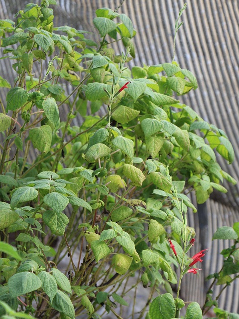 サルビア ロンギスティラは寒さに弱い秋咲き。長くなる花穂に細く長い花。ワインレッドの花色が大変美しいサルビアです。メキシコ原産だそうですね。寒さに弱い秋咲きと言いましても戸外で花を見る事ができるものとできないものがありますが、このサルビアはすぐやってくる寒さにうちでは防寒なしでは咲き始めしか見る事ができません。防寒するには秋までに2m以上になる為大変です。そこで庭植えは諦め鉢植えにして、剪定をしながら無加温のフレームで育てるようになりました。夏場は葉焼けがかなり気になりますので少し遮光をしています。種を蒔いてから6年になります。伸び伸びと育てるにはスペースがなく難しいのですが、寒さに気を付ければ概して丈夫なサルビアだと思いました。