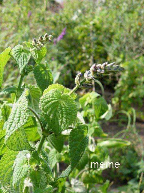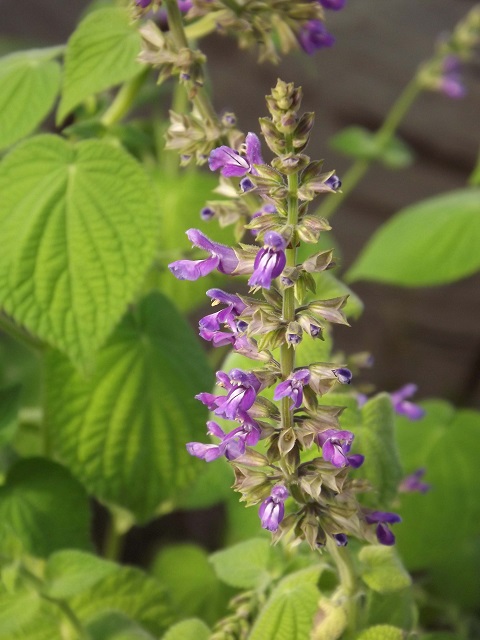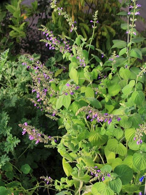 秋も終わりに近づきますと咲き始めるSalvia myriantha サルビア ミリアンタ。ハート型をした大きな葉に反して一つひとつの花は小さ目で下唇の白い模様が目立つ赤紫色です。見頃になりますとかなり密に花が付き葉は反り返り、上の方の葉は小さいです。この10年ちょっとで地植えでも少しの間花を見る事ができるようになりました。然し本来、非耐寒性多年草の冬咲きのサルビアの為、本格的な寒さが来る前に堀上げや挿し木、又は花を見るために鉢植えを仕立ておくとよいと思います。冬の日光がよく当たる無加温のフレーム内に直植えをした一株は多少紅葉をしながらも次々と咲き、付ける花の数はまばらになりますが梅雨頃まで咲いていた年もありました。種子を求めた時の説明書きにはメキシコ原産とあり、花の時期には草丈は1.5m位になります。花の咲かない春から秋に掛けて旺盛に育ち、地面に付いた茎からも良く根を出し広がる程丈夫な上、種取りも出来ます。毛の生えている葉や茎は残念ながらよい香りとは言えませんが、それを補うだけの美しい独特な花色だと思います。