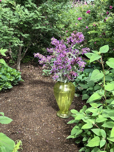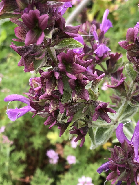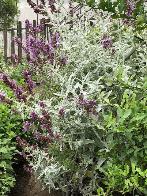 サルビア カナリエンシス ‘ランスロット’ は苗から育て始めて今年で4年目です。小さな苗のうちから毛が生えて銀色に見える茎や葉が特徴的で、ポリエステルの手芸綿にくるまっているかの様に見える時もあります。草丈が高くなりましても下から上まで銀色に見え、他の緑色の植物の中で目立ちます。6月頃から秋の終わりまで繰り返し長く咲く紫を帯びたピンク色の花、そして深い紫のガクがまた美しいです。ラベルには90〜120cmと書かれており、うちでは2年目の春に地植えにしたところ180cmを超えました。余り大きくならない品種だと聞いていましたので驚きました。梅雨時は傷みますが比較的丈夫で、梅雨の前か後に剪定をしたり切り花として活用をしたりしているうちに元気になります。耐寒性もまずまずのようで、落ち葉のマルチで越冬します。庭ではダイナミックに、鉢植えは剪定で枝数を増やしてコンパクトに育てるのも面白いです。鉢植えは根で土が硬くなるのが早い為、秋か春の植え替えは必須だと思います。この時、株分けや挿し木でバックアップの苗を作っています。サルビア カナリエンシスは以前メモしました S. canariensis、S. canariensis var.albiflora、S. canariensis var.candidissima に、このS. canariensis ‘Lancelot’ が加わり4種類になりました。葉の色や繊細さ、そして花色などに特徴がありますが、どれもガクの美しさに見惚れてしまうサルビアです。